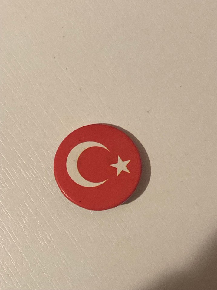 Koyu kırmızı zemin üzerinde beyaz hilal ve yıldız bulunan, vintage tarzda Türk bayrağı rozeti.