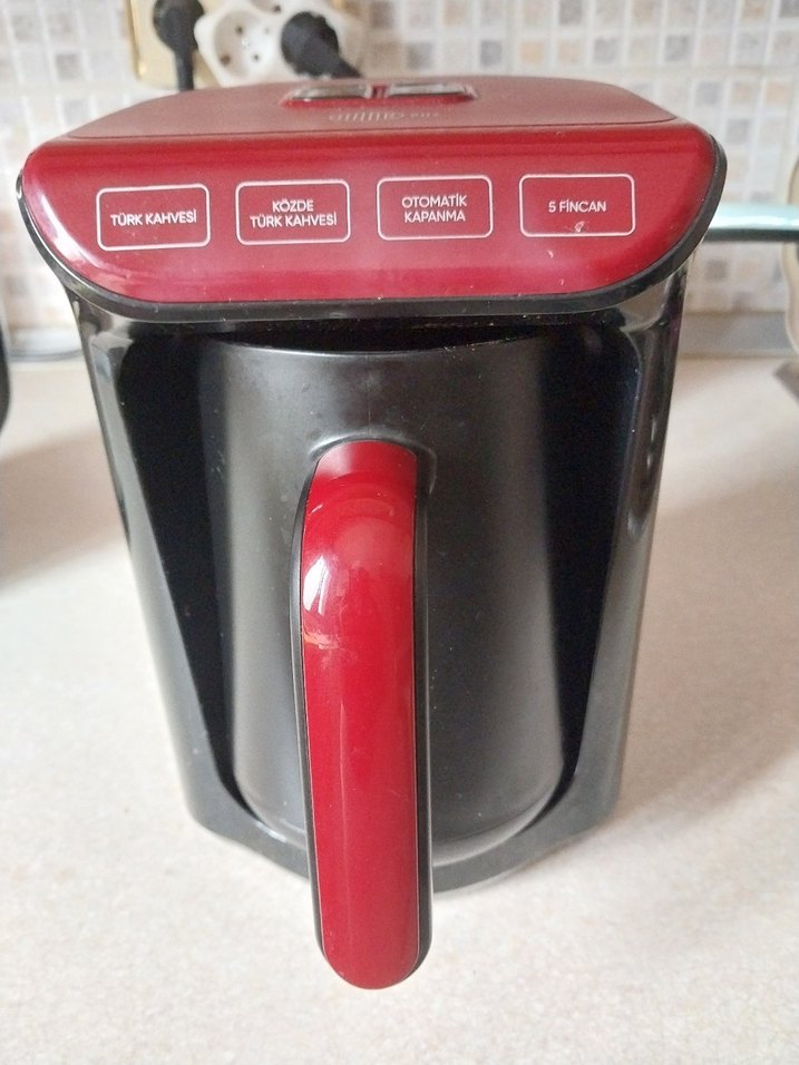Koyu kırmızı renkte, otomatik kapanma özellikli, 5 fincan kapasiteli Türk kahvesi makinesi. Üzerinde Türk kahvesi seçenekleri bulunur. ☕ Ürün çalışmıyor garantisi var servisinde yaptırılabilir