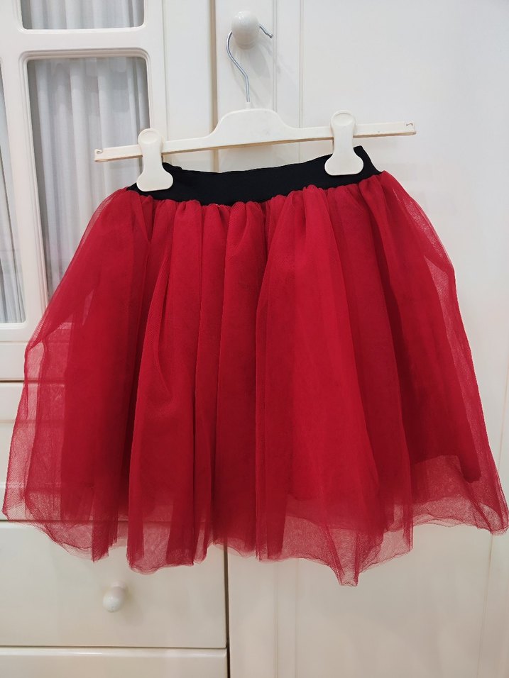 Kız çocuk için siyah bel bantlı, kırmızı koyu renkte, sentetik kumaştan yapılmış salaş kesim ve fırfırlı tarzı etek. 23 Nisan gösterisi için bir kere giyildi. bel lastiği 25 cm. boy 45 cm