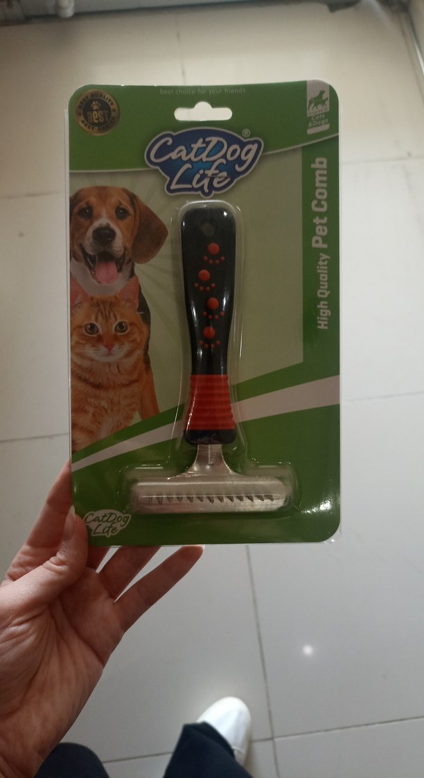 Kedi ve köpekler için tüy bakımında kullanılan koyu kırmızı renkli, rahat tutuşlu tarak.
