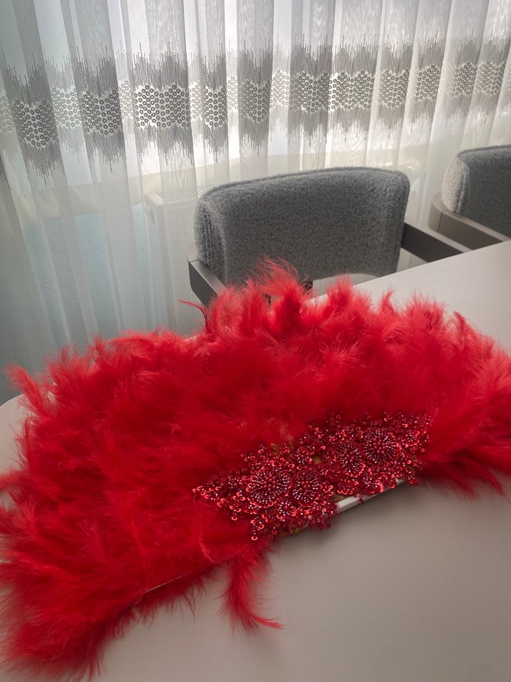 Canlı kırmızı renkte, tüylü ve boncuk işlemeli sentetik kumaştan kadın saç aksesuarı, pop kültür tarzında avant-garde görünüm sağlar.
