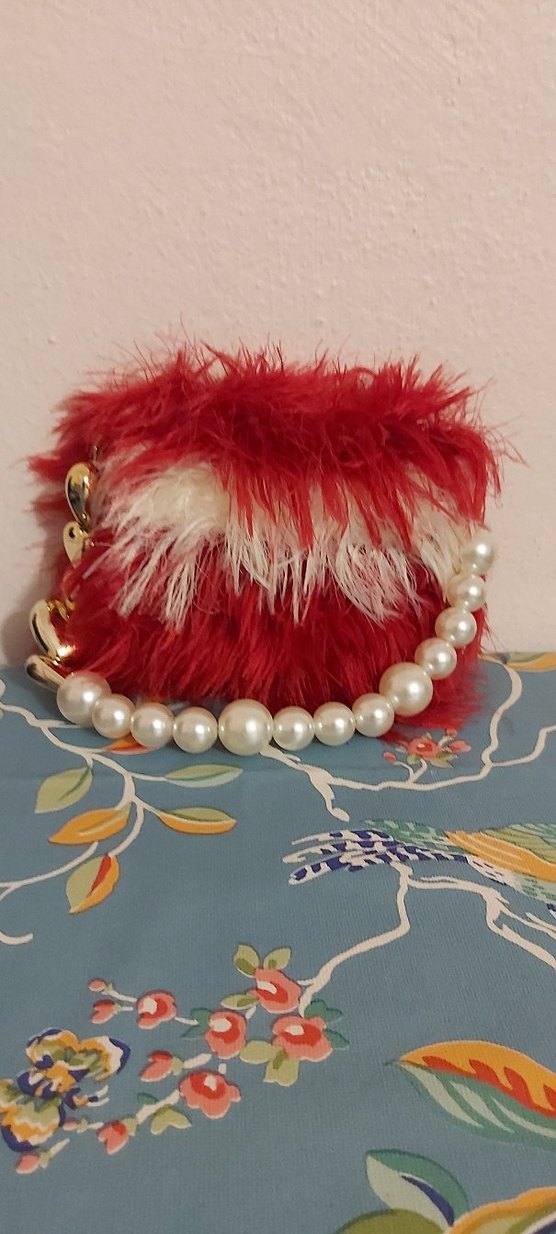 Kırmızı tüylü, inci detaylı ve altın süslemeli renkli el çantası, el emeği çanta