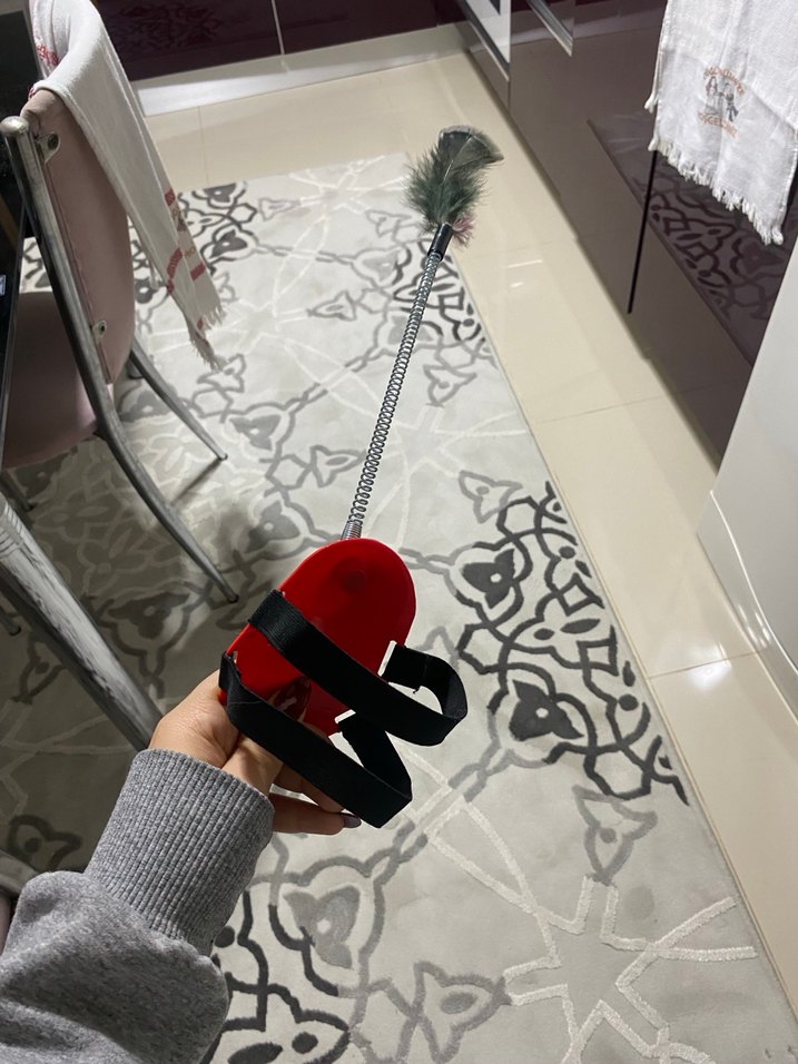 Kırmızı yumuşak tabanlı, siyah bantlı ve uçunda tüy olan esnek kedi oyuncağı. Benim kedim oynamadığı için satıyorum