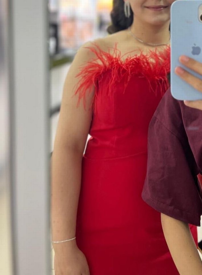 Kırmızı, tüylü detaylı straplez midi boy, vücuda oturan abiye elbise. Parlak kumaşı ve kolsuz tasarımıyla dikkat çeker. M ve L beden uygundur