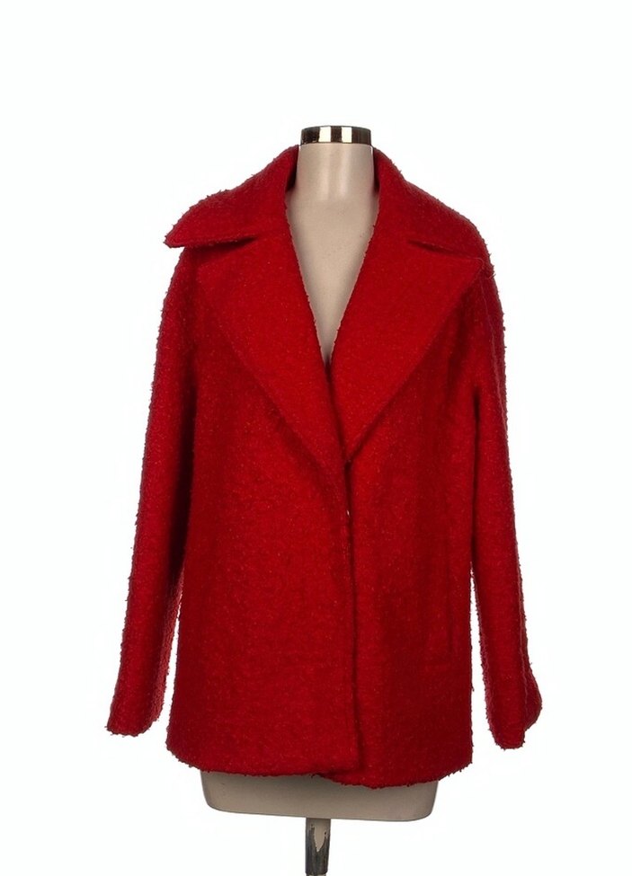 Kırmızı yün kadın kaban, kesik yakalı ve düğmeli. Uzun kollu, bol kesim ve parlak dokusu ile ofis için uygundur.