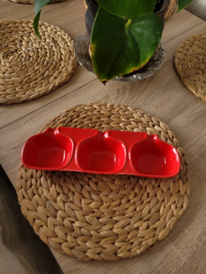 Canlı kırmızı renkte, üç bölmeli servis tabağı. Atıştırmalık veya soslar için kullanışlı, desensiz ve sade tasarımda. ️şık sunumlarda, kahvalti, atıştırmalık vs için kullanabilirsiniz. hic bur kusuru yok, ihtiyac fazlası, dolapta bekledi, belki bir kez kullandım, o derece yeni.❤️