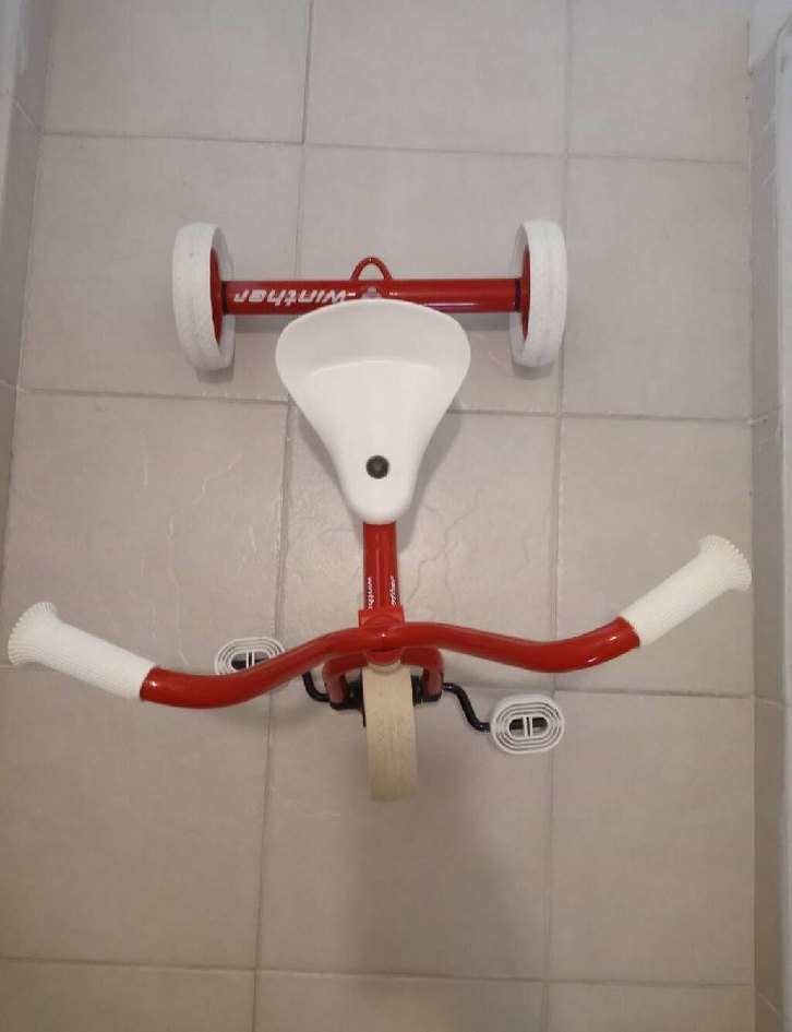 Çok az kullanılmıştır. Yerden tutma yerine yükseklik 51cm, Ön tekerlekten arka tekerleğe 58cm, tutma yerleri arası uzunluk 41 cm. Sağlam ve tekerlek yapısı nedeniyle sessizdir. Ev içinde kullanıldı tertemiz durumda muhafaza edildi. Danimarka dan geldi, çok memnun kalırsınız. Kırmızı gövde, beyaz sele ve gidona sahip çocuklar için üç tekerlekli bisiklet. Dayanıklı yapıya ve renkli tasarıma sahiptir.
