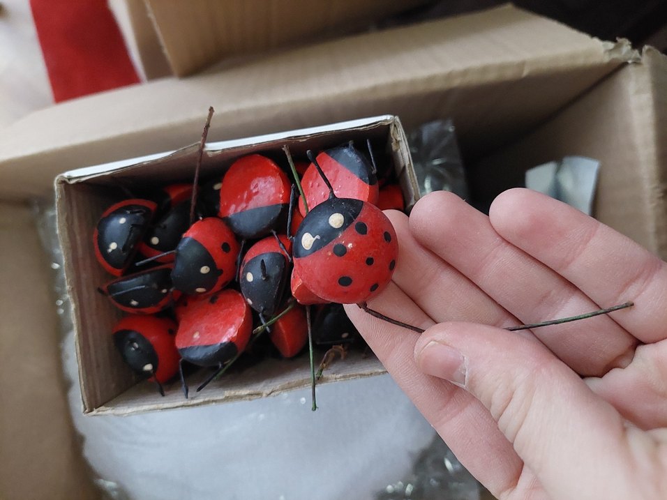 Siyah benekli, ince tel bacaklı küçük kırmızı uğur böceği figürleri, dekorasyon için uygun.