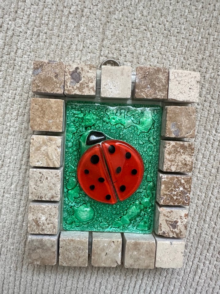 Cam kırmızı uğur böceği ve yeşil zemin üzerinde doğal taş bloklarla çevrili renkli tablo.