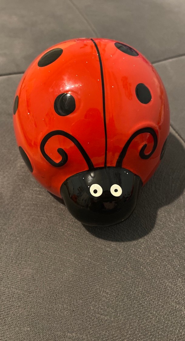 Siyah benekli ve antenli kırmızı renkli, renkli uğur böceği kumbara boya sıçramış yerleri mevcuttur üçü geniş kapağıyla tam settir