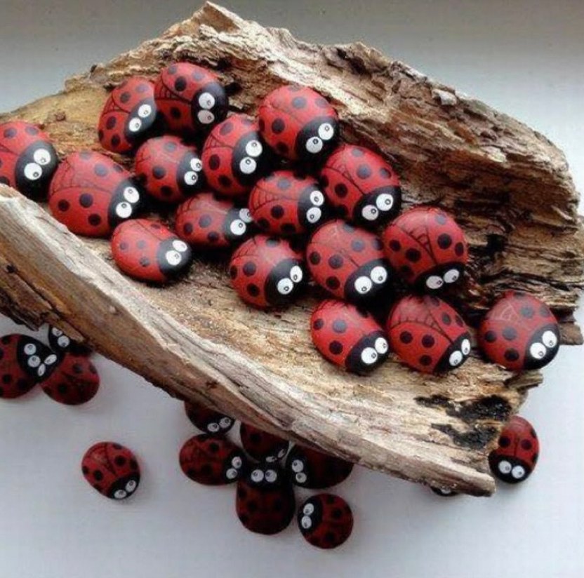 Canlı kırmızı renkli, sevimli uğur böceği taş süsleri.