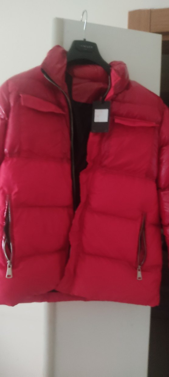Koyu kırmızı renkte, paraşüt malzemeden yapılmış, yüksek yakalı ve fermuarlı cepli, normal midi boyda, uzun kollu, rahat kesim kadın kış mont şişme