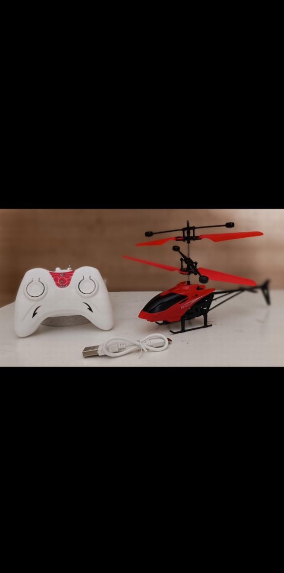 Kırmızı renkli uzaktan kumandalı helikopter, beyaz kumanda ve USB şarj kablosu ile birlikte. Canlı renkler oyuncak keyfini artırır.