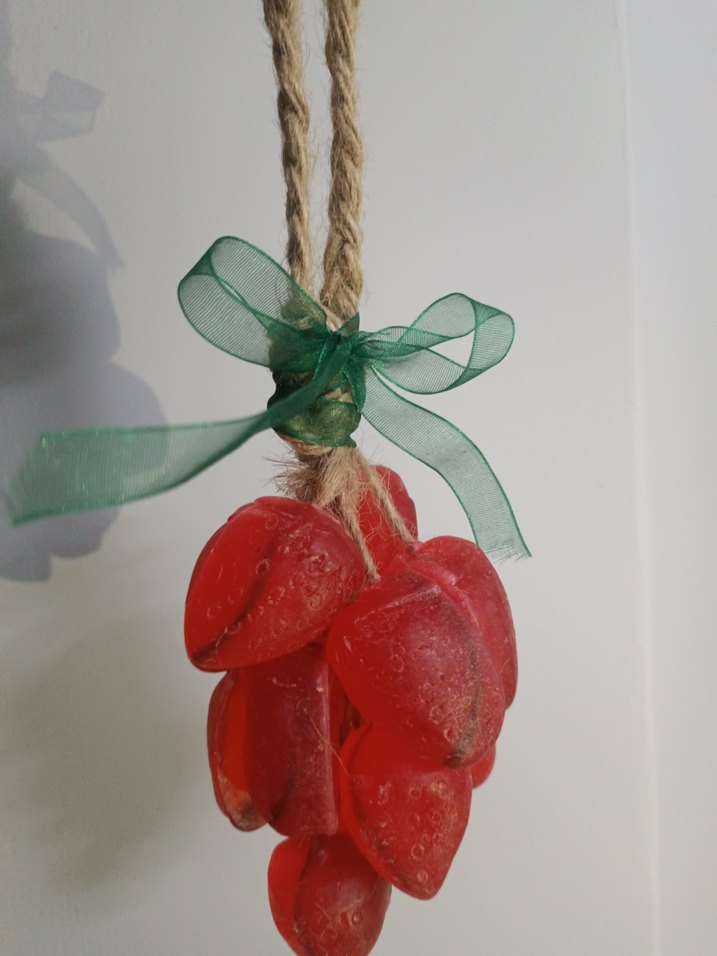 Kırmızı, üzüm şeklinde asılabilir sabun, ip ve yeşil kurdele ile süslenmiştir. çilek kokulu