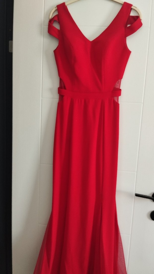 Kırmızı, uzun, dar kesim abiye elbise, ince askılı ve kayık yaka detaylıdır. Parlak kumaşı ve drapeli tasarımıyla modern, minimalist bir şıklık sunar.
