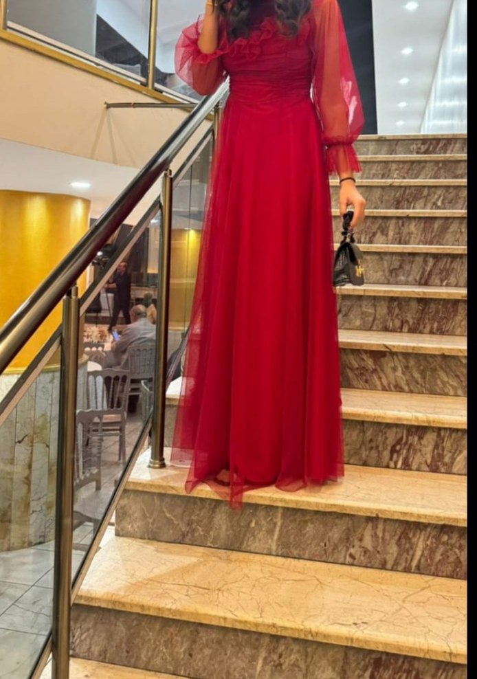 Kırmızı uzun abiye elbise, uzun kollu ve straplez yaka ile drapeli detaylara sahiptir. Düğünler için uygundur ve modern klasik tarzdadır. 36/38 bedene uyumlu Sok şık şifon abiye Saatlik giyildi sıfır ayarında