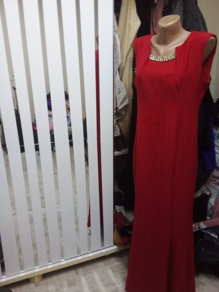 Kırmızı uzun abiye elbise, V yakalı ve kolsuzdur. Düzenli kesim ve drapeli detaylara sahiptir. Parlak kumaşıyla klasik ve çağdaş bir şıklık sunar.