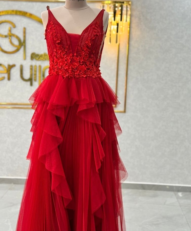 Kırmızı, nakışlı ve parlak detaylara sahip, V yakalı, askılı ve kat kat fırfırlı uzun abiye elbise. Düğünler için uygundur.