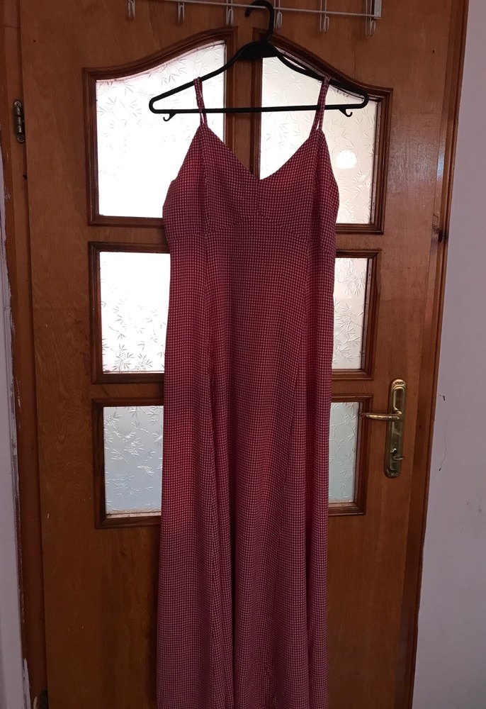 kırmızı renkte, uzun ve askılı, V yakalı, drapeli ve vücuda oturan minimalist tarzda günlük kullanıma uygun elbise.