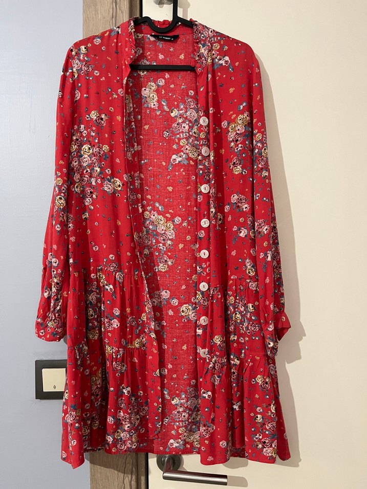 Koyu kırmızı renkli, uzun kollu ve desenli, bol kesim bohem tarzı tunik