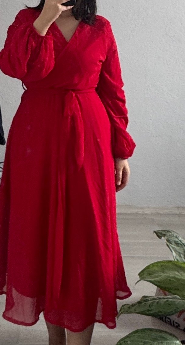 Kırmızı renginde, uzun ve bol kesimli, V yakalı, dökümlü detaylara sahip, satenimsi kumaştan yapılmış, uzun kollu parlak elbise, düğünler için uygun.