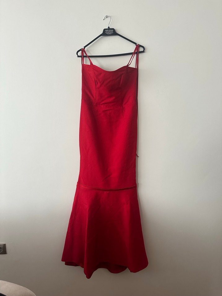 Kırmızı, boyundan bağlamalı, arka etek kısmında kurdele detaylı ve etek kısmı pileli uzun abiye elbise.