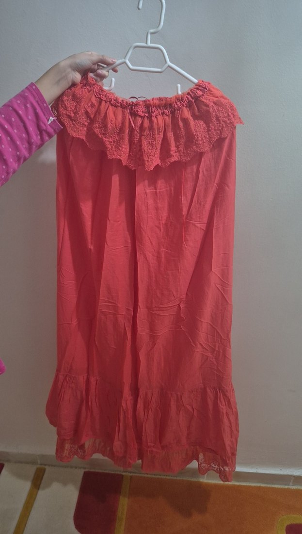 Parlak kırmızı keten kumaştan, uzun ve bol kesim buyuk beden strabzlez elbise