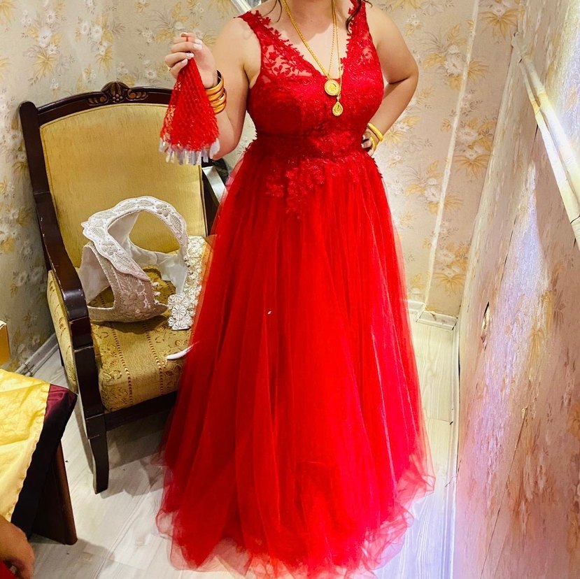 Kırmızı, dantel detaylı, straplez ve kolsuz, vücuda oturan uzun abiye elbise, düğünler için uygun.bir kere kendi kınamda giydim