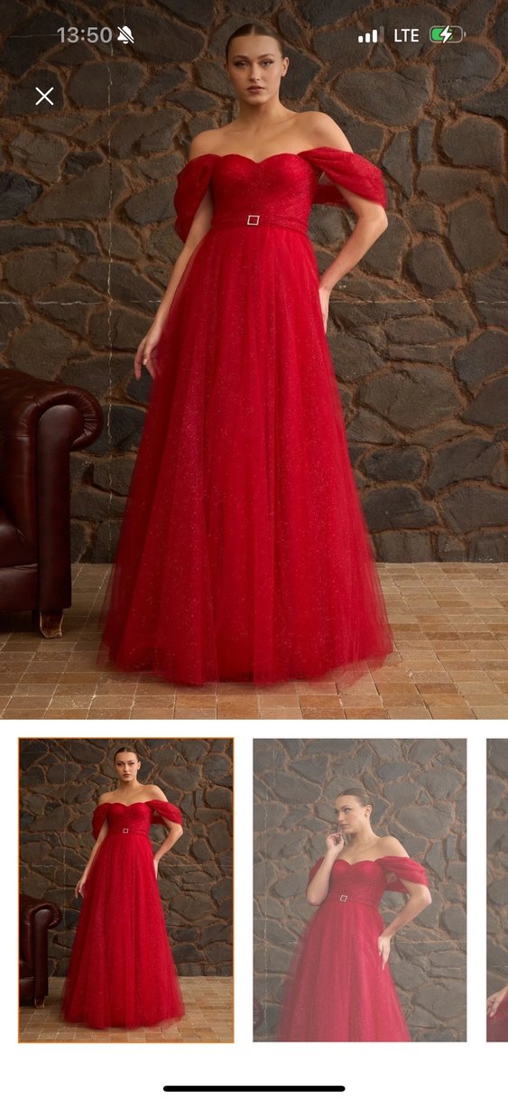 Parlak kırmızı renkte, uzun abiye elbise. Kayık yaka, klasik şıklık için uygun bir modeldir. Bu uygulamadan çok yakın zamanda aldım ama bedeni bana uymadı. Sadece kemerindeki tokası yoktur onun dışında temiz ve yenidir. Kuru temizlemeye ihtiyacı yoktur. Ben çok beğendim ama maalesef giyemeyeceğim. Alışverişimde görebilirsiniz aldığım kişinin üstündeki duruşunu