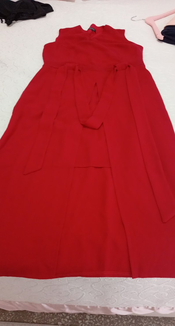 Kırmızı, uzun ve drapeli hamile eteği, ince ve parlak kumaştan, bol kesimle romantik akşamlar için uygundur. Minimalist ve bohem tarzı yansıtır.