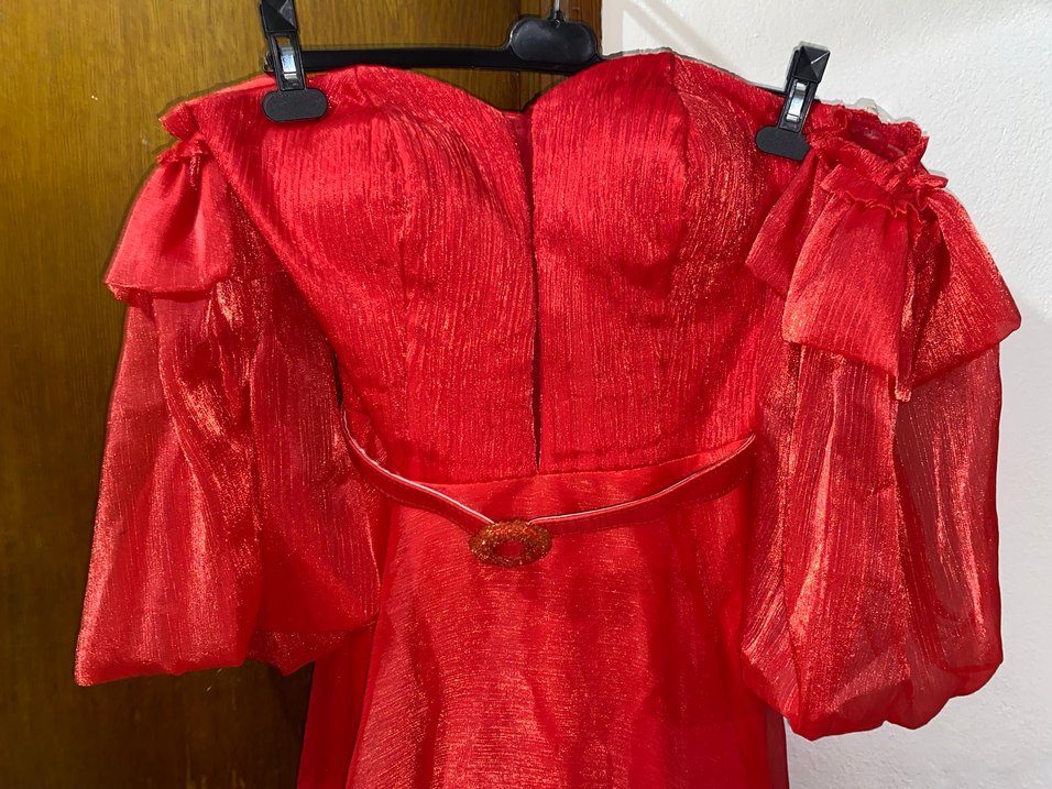Parlak kırmızı renkte, tek renk, drape detaylı, uzun boy, balık kesim, kayık yaka ve askılı kolları olan kadın abiyesi. ✨