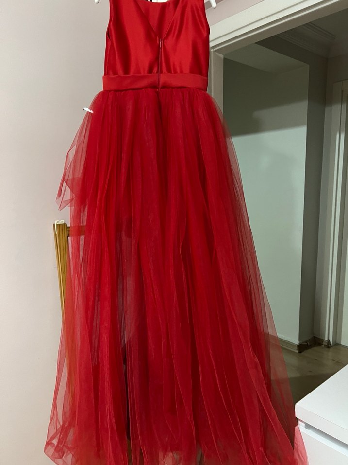 Kırmızı renkte, V yakalı ve kolsuz, vücuda oturan uzun abiye elbise. Drapeli tül etek ile şık ve gösterişli bir tasarım sunar.