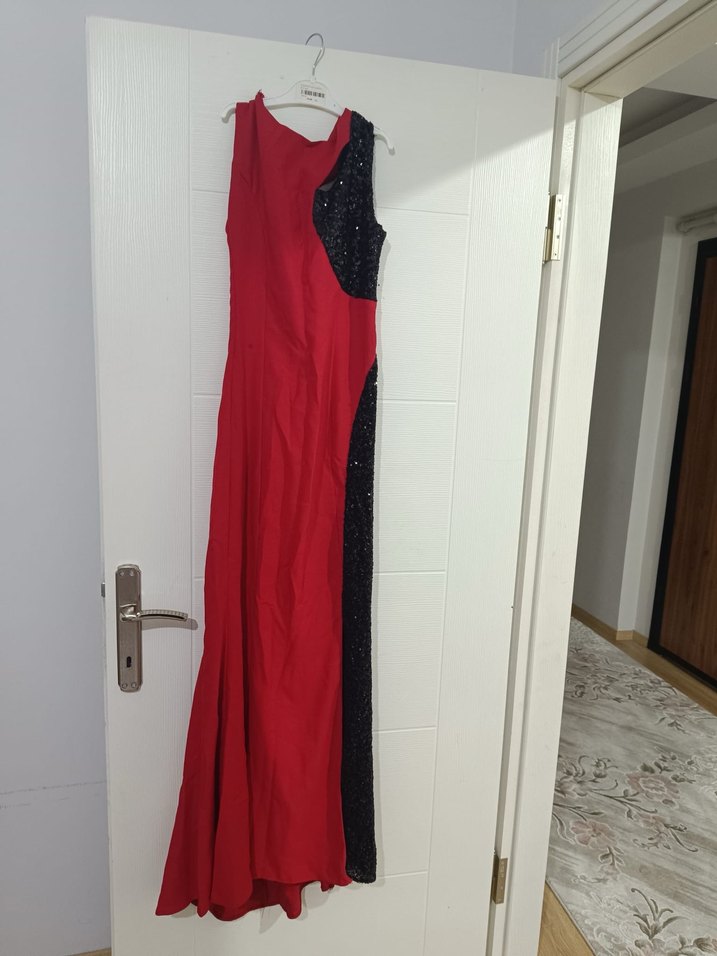 Kırmızı Uzun Drapeli Kadın Abiye Elbise