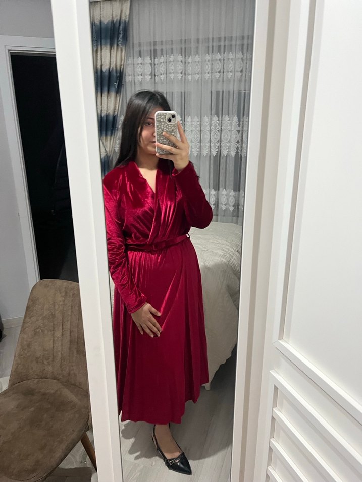Kırmızı, parlak, ipeksi kumaştan, drapeli ve V yakalı uzun, beli kemerli, uzun kollu kadın elbisesi. Romantik akşamlar için uygundur.