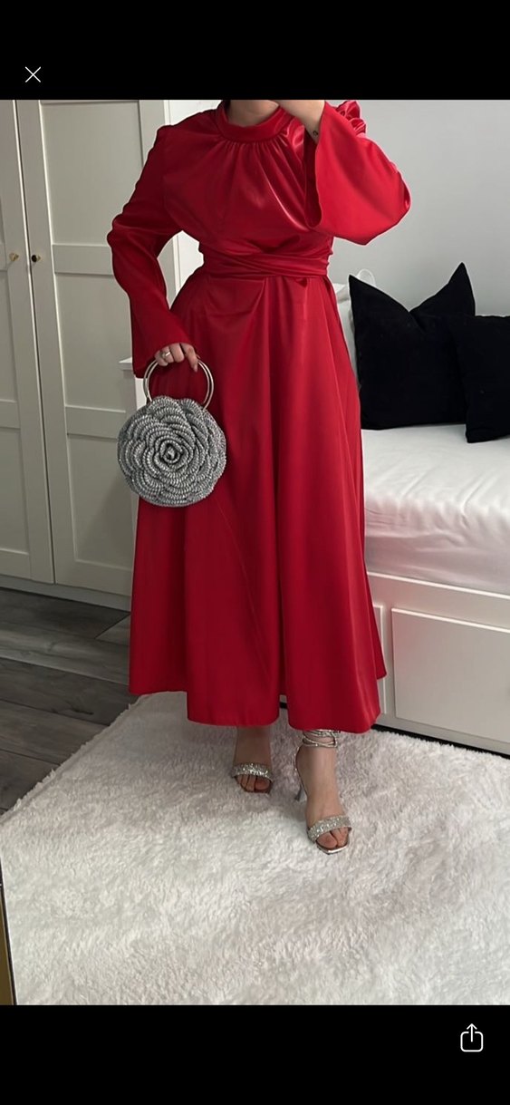 Kırmızı uzun elbise, straplez yakalı ve bol kesimdir. Drapeli detaylarla sentetik kumaştan üretilmiştir. Düğün ve özel günler için uygundur.