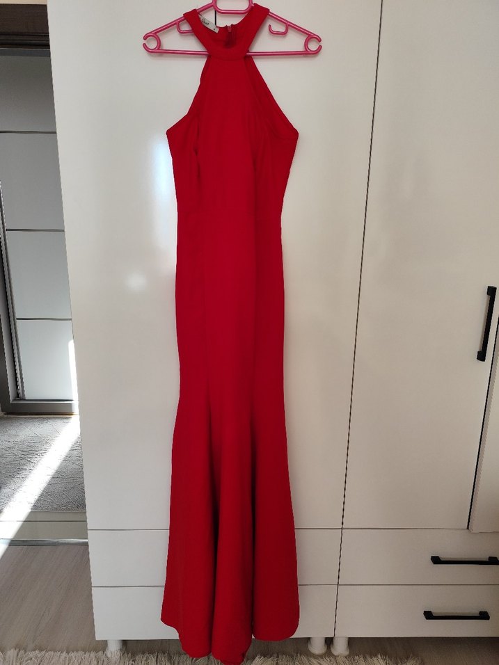 Kırmızı, uzun, drapeli ve kolsuz bu klasik elbise, yüksek yakasıyla zarif bir görünüm sunar. Romantik akşamlar için uygundur. ❤️