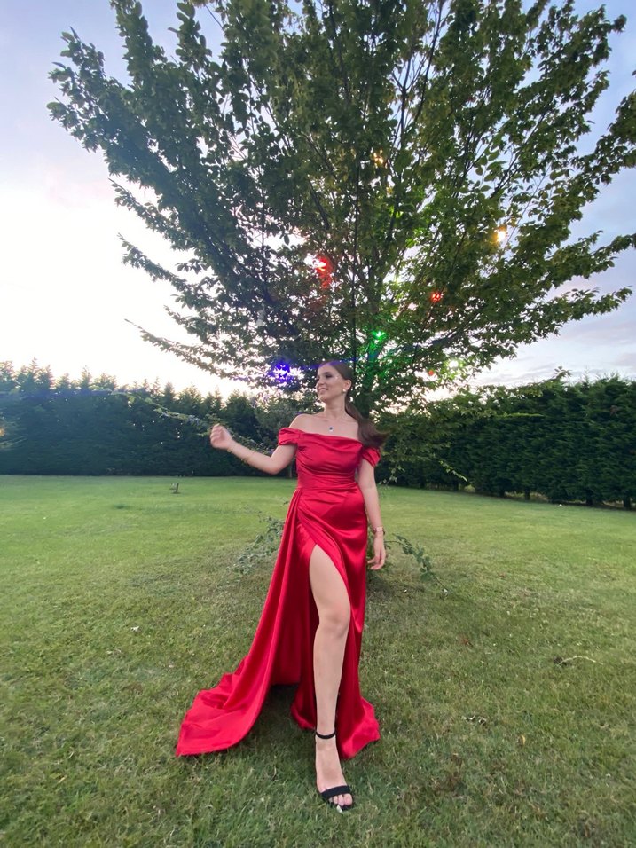 Parlak kırmızı uzun elbise, drapeli ve straplez yakalı, dar kesim, yüksek yırtmaçlı, düğün için uygun.