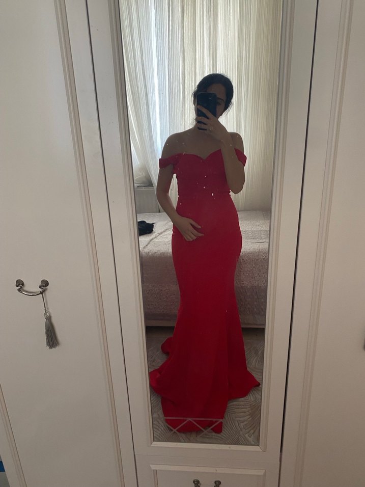 Bu kırmızı, uzun ve dar kesim abiye elbise straplez yaka ve drapeli detaylara sahiptir. İnce askılı kollu, modern klasik tarzda, romantik akşamlar için uygun. ❤️
