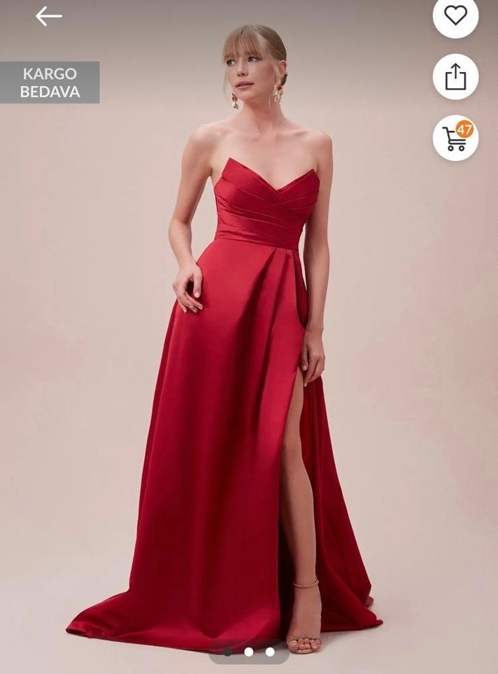 Fitted kesim, straplez kırmızı abiye/kına elbisesi. Drapeli detaylara ve yırtmaçlı uzun eteğe sahiptir. Parlak kumaştan, cepleri var. Davetlerde çok şık duracağı gibi kına gecenizde de kullanabilirsiniz, duruşu kalitesi o derece yüksek.Markası Oleg Cassini. Göğüs kısmında kendi pedlerine sahip, rahatlıkla kullanabilirsiniz. Kumaşı, kesimi tam anlamıyla harika.Bel kısmından daraltma yapıldı, ilgilenenlere ölçüleri yazacağım.Kargo bedava.