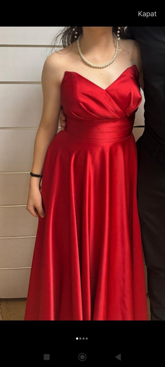 Parlak kırmızı renkte, drapeli , klasik tarzda, uzun ve straplez yaka, oturan kesim abiye elbise. cepleri mevcut , marka temsili