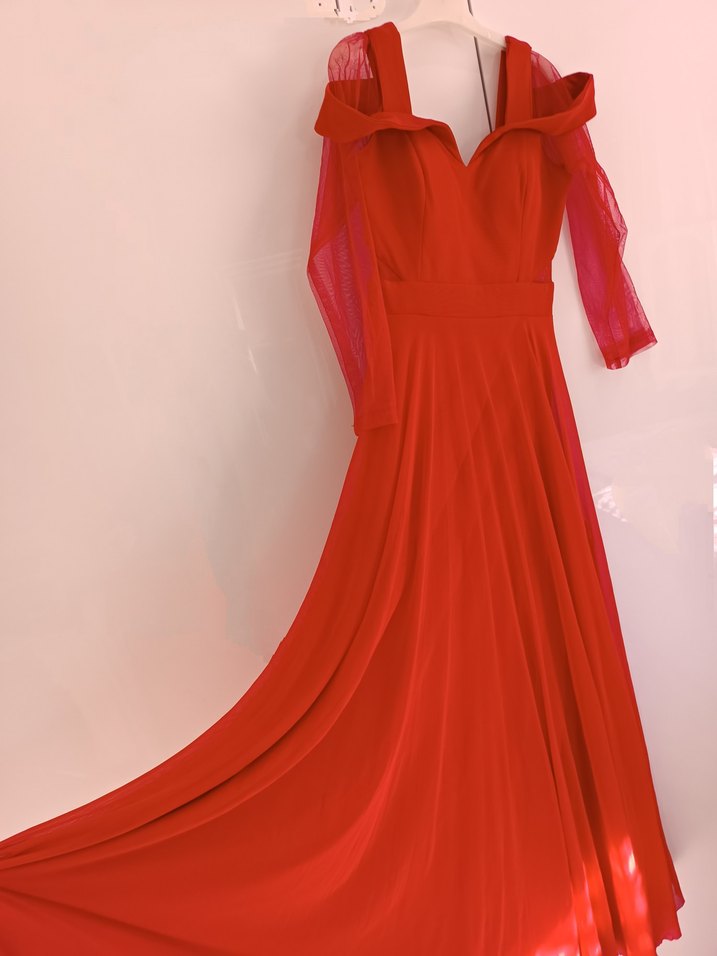 Kırmızı, uzun ve drapeli bu abiye elbise, V yaka ve askılı kollara sahiptir. Parlak kumaşıyla düğünler için göz alıcıdır. fiyat temsilidir