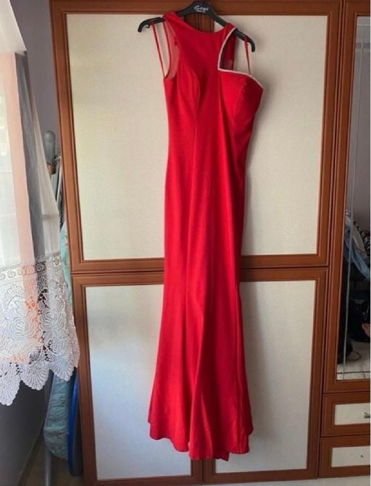 Fitted kesim, drapeli tasarım, V yakalı ve kolsuz uzun abiye elbise. Parlak kırmızı kumaş, modern klasik stil sunar, düğünler için uygundur. ✨