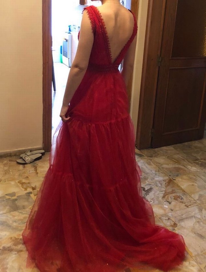 NS SPOSA -ADL MAĞAZALARINDA SATIŞTA, 1 kez Nişanda giyildi. Uzun kırmızı abiye elbise, drapeli tasarım ve derin V yakaya sahip. İnce askılı ve parlak yüzeyli, düğünler ve özel anlar için uygun.