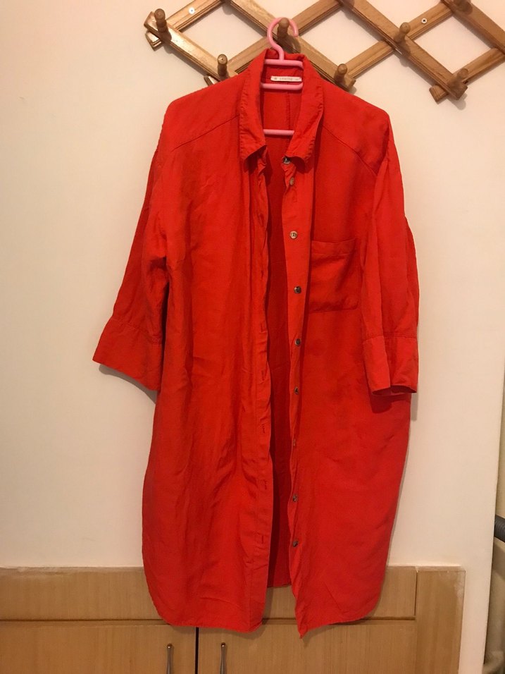Kırmızı uzun keten tunik , düğmeli ve geniş kesimdir. Minimalist sokak stiline uygun, parlak ve desen içermeyen tasarıma sahiptir. Uzun kolludur ve günlük kullanıma uygundur. Su izi gibi bir iz var çıkabilir de bilmiyorum o yüzden uygun