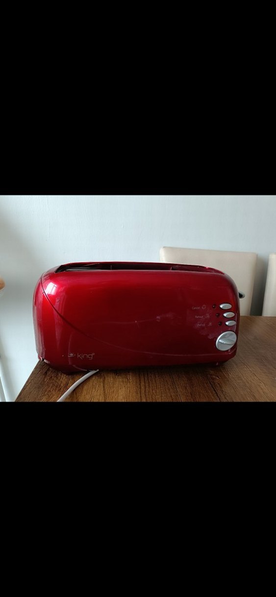 Koyu kırmızı renkte, uzun ekmek kızartma yuvası ve yan tarafında farklı kızartma seviyeleri için kontrol düğmeleri bulunan tost makinesi.