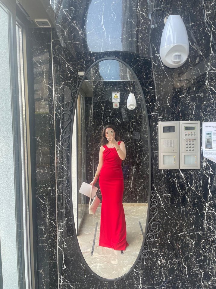 1-2 kez giydim. Parlak kırmızı , straplez ve vücuda oturan uzun elbise, balık tipi.