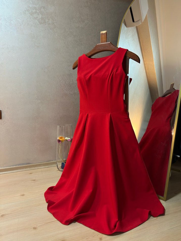 Kırmızı renkte ve kolsuz, cep detaylı uzun elbise. Düz ve klasik kesimiyle hem günlük stile uygun hem de özel günlerde tercih edilebilecek bir elbise. Çok canlı bir kırmızı rengi, tam kırmızı severler için. Yeni gibi, defosuz.