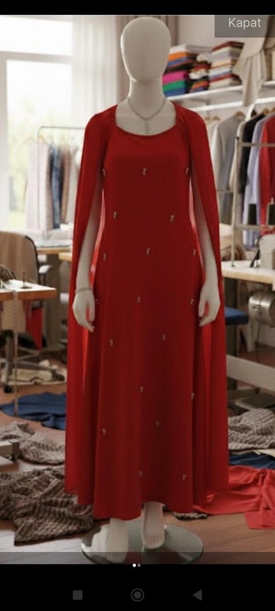 Uzun, bol kesim kırmızı elbise, drapeli kollar ve detaylı nakışlarla süslenmiştir. Straplez yakalı, parlak görünümlüdür. (1KERE GİYİLDİ YAKASI BANA BOL GELDIGI İÇİN TERZİDE YAPTIRDIM HİÇ Bİ DEFOSU YOK TERTEMİZ SIFIR ELBİSE) İndirim yapılır