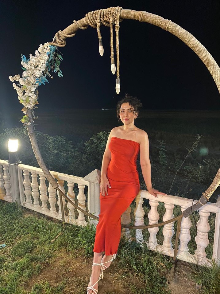 Kırmızı, parlak etnik desenli, straplez ve drapeli uzun elbise, ince ve bohem tarzda düğünler için uygun. Etiketini kaşındırdığı için atmıştım ama bershkanındır
