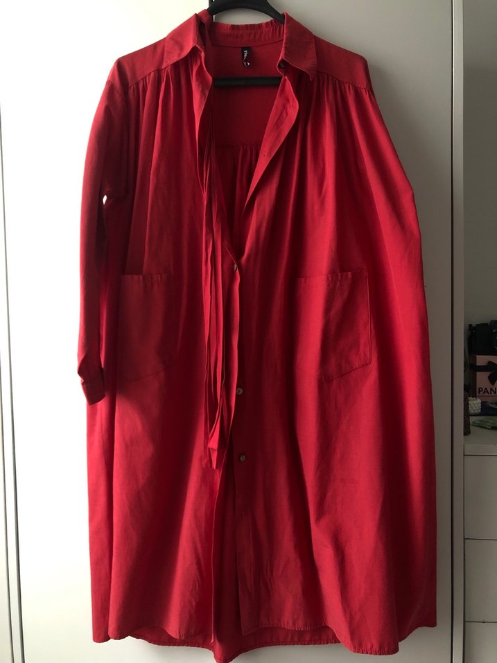 Parlak kırmızı uzun tunik, drapeli detaylar ve kesik yaka ile uzun kolludur. Rahat ve bol kesimiyle ofis için uygundur. Trençkot olarakta kullanılır